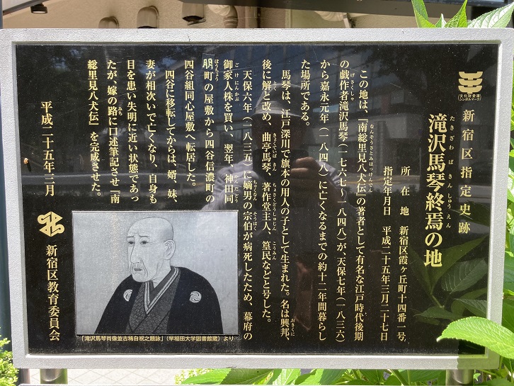 この地は、「南総里見八犬伝」の著者として有名な江戸時代後期の戯作者滝沢馬琴(1767年〜1848年)が、天保七年(1836年)から嘉永元年(1848年)に亡くなるまでの約十二年間暮らした場所である。馬琴は、江戸深川で旗本の用人の子として生まれた。名は興邦、後に解と改め、曲亭馬琴、著作堂主人、篁民などと号した。天保六年(1835年)に嫡男の宗伯が病死したため、幕府の御家人株を買い、翌年、神田同朋町の屋敷から四谷信濃町の四谷組同心屋敷へ転居した。四谷に移転してからは、婿、妹、妻が相次いで亡くなり、自身も目を患い失明に近い状態であったが、嫁の路に口述筆記させ「南総里見八犬伝」を完成させた。