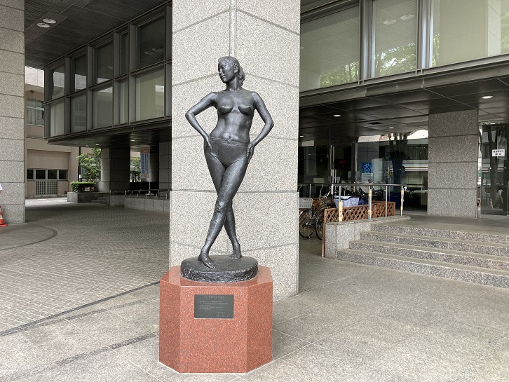 見所ポイント1の「ジーンズ像」は、杉並区役所の中杉通り側のエントランス前に建てられています。上半身は服を着ていないので、どこがジーンズ像かと思ったのですが、よくよく見ると足に密着したジーンズを穿いています。台座のプレートには、「杉並区平和都市宣言」と書いてあります。平和宣言とジーンズって、何か関連はあるのでしょうか?ちなみに、「はく」の漢字表記ですが、「ズボンをはく」「スカートをはく」といった、足をとおして下半身に衣服をつける場合は「穿」の漢字を使います。一方、靴下やスリッパや靴などを足につける場合には「履」の漢字を使います。では、パンストは?パンストは衣服でなく靴下の範疇と考えられますので、「履」の漢字を使うのが正しいようです。ま、迷ったら平仮名で書けばいいんですけど。