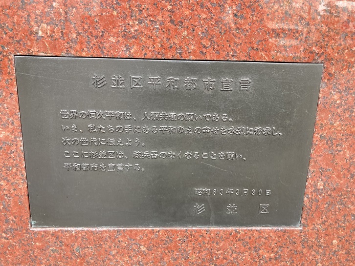 世界の恒久平和は、人類共通の願いである。いま、私たちの手にある平和ゆえの幸せを永遠に希求し、次の世代に伝えよう。ここに杉並区は、核兵器のなくなることを願い、平和都市を宣言する。
