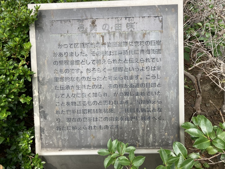 かつて区役所前の青梅街道際に皀莢の巨樹がありました。その樹は江戸時代に青梅街道の里程指標として植えられたと伝えられていたものです。おそらく一里塚というよりは半里塚的なものだったと考えられます。こうした伝承が生れたのは、その樹が街道の目印として人々に良く知られ、かつ親しまれていたことを物語るものと思われます。当初植えられた皀莢は昭和十四年枯死、二代目も病気となり、現在の皀莢はこの由来を後世に残すべく、新たに植えられたものです。