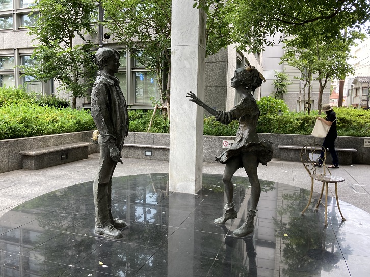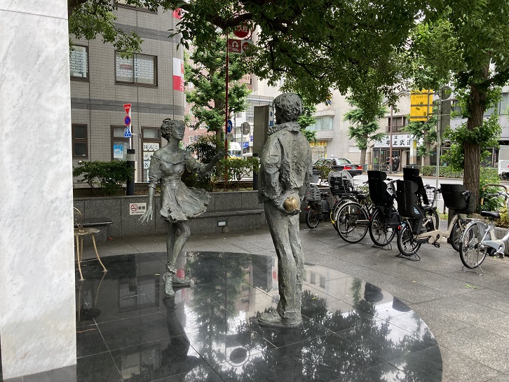 もうひとつの見所ポイント1の「お誕生日おめでとう像」は杉並区役所正面入口広場の隅にあります。円形の台座の上に立った若い男の子が恋人の女の子にお誕生日のプレゼントを渡そうとしています。お金がなく高価な品は贈れないので、その辺にあった林檎をプレゼントの品にするみたいです。女の子の期待に満ちた表情とポーズが何とも微笑ましいですね。もっとも、この後どうなったのか知りませんけど。。。