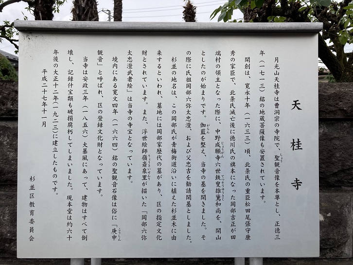 月光山天桂寺は曹洞宗の寺院で、聖観音像を本尊とし、正コ三年(1713年)銘の地蔵菩薩像も安置されて います。開創は、寛永十年(1633年)頃、北条氏の重臣松田尾張守康秀の家臣で、北条氏滅亡後に徳川氏の旗本になった岡部吉正が田端村の領主となった際に、中野成願寺六世鉄叟雄(さく:族に鳥)和尚を、開山としたのが始まりです。伽藍を整え、当寺の基を開きました。その際に氏祖岡部六弥太忠澄、および父忠吉を勧請開基としました。杉並の地名は、この岡部氏が青梅街道沿いに植えた杉並木に由来するといわれ、墓地には岡部家歴代の墓があり、区の指定文化財とされています。また、浮世絵師嶺斎泉里が描いた「岡部六弥太忠澄武者絵」は当寺の寺宝となっています。境内にある寛文四年(1664年)銘の聖観音石像は俗に「庚申観音」と呼ばれ、区の登録文化財となっています。当寺は安政三年(1856年)大暴風にあって、建物はすべて倒壊し、記録什宝類も破損腐朽してしまいました。現本堂は約六十年後の大正十二年(1923年)に建立したものです。