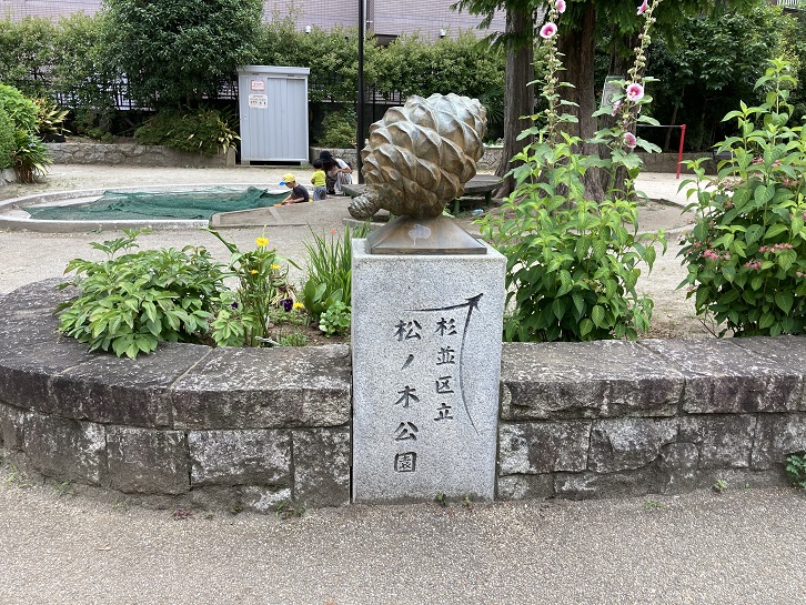 松ノ木公園は住宅地の中にあり、公園の外周にはビョウヤナギ・ヒョウガミズキ・ジンチョウゲ・サツキなどの植込みがあります。四角い広場には、アケボノスギが数本立ち、緑の木陰をなしており、その下の砂場に連なるようにすべり台とブランコがあります。この辺り一帯の町名は「松ノ木町」と住居表示されていますが、その由来は単にかって松の木が生えていたということだけらしいです。それにしても巨大な松ぼっくりですね。