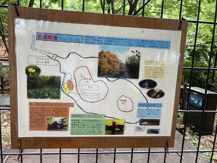 昭和三十年代、善福寺川の河川改修工事の際に作られた人工池。面積は約5,200u。南北に長く約137m・東西約65m。水は善福寺川からポンプで汲み上げた河川水と井戸水を利用している。水深は約30cm・最深部で約70cm。カワセミをはじめ数多くの野鳥が訪れ、野鳥愛好家に人気がある。