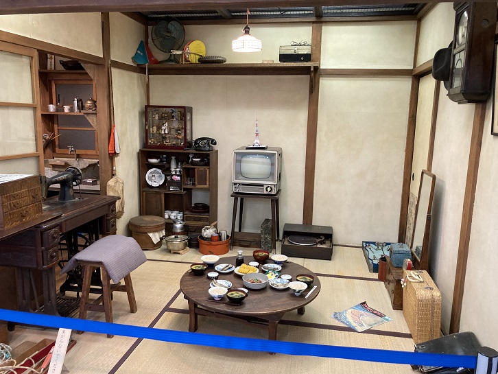 昭和三十年代頃の一般家庭の風景なのでしょうか、当時の生活様式が窺えます。ちゃぶ台にミシンにテレビに柱時計。畳に座って家族団らんのひとときを過ごしていたのでしょう。ポリ袋もなかった時代ですから、お買い物には竹籠が必需品でした。今の時代のマイバックよりは遙かに衛生的だったですね。冷蔵庫は氷で冷やすタイプが主流で、お魚は七輪で焼いていました。よくこれだけの品を集めたもんです。