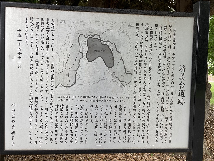 この辺り一帯には、善福寺川に囲まれるようにして済美台遺跡が点在しています。広場の入口に案内板が立っています。