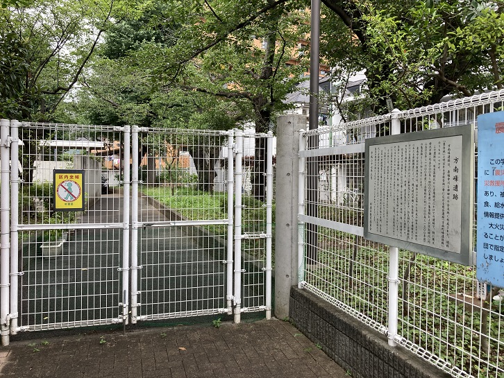 善福寺川に架かる定塚橋を渡って階段を上ります。その先の泉南中学校の敷地の中に方南峰遺跡があります。学校の敷地の外からは遺跡の痕跡は見当たりませんが、フェンスに案内板が掲げられています。余談ですが、方南通りに「峰」という名前のバス停があります。方南峰遺跡と同じく、「峰」はこの辺りの古い小字(こあざ)の名称なのだそうです。更に言うと、方南通りを尾根道として東に突き出た舌状台地を「峰」と呼んでいたことに因むようです。地名からかっての地形が推測できるもんなんですね。