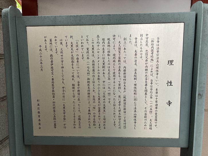 西永福駅に隣接して理性寺があります。大久保越中守忠辰・甚兵衛尉忠陰兄弟が両親の父荒之助忠富(法眞院日堯)・母久世氏(理性院日然)のために久世氏より土地を譲り受けて内藤新宿に創建したといわれています。大正三年に現在地へ移転しました。境内左手の大黒殿には「火伏せの大黒天」と呼ばれる高さ約12センチメートルの木彫りの大黒天が安置されています。寛政六年(1794年)に御殿医の木村検校により奉納されました。