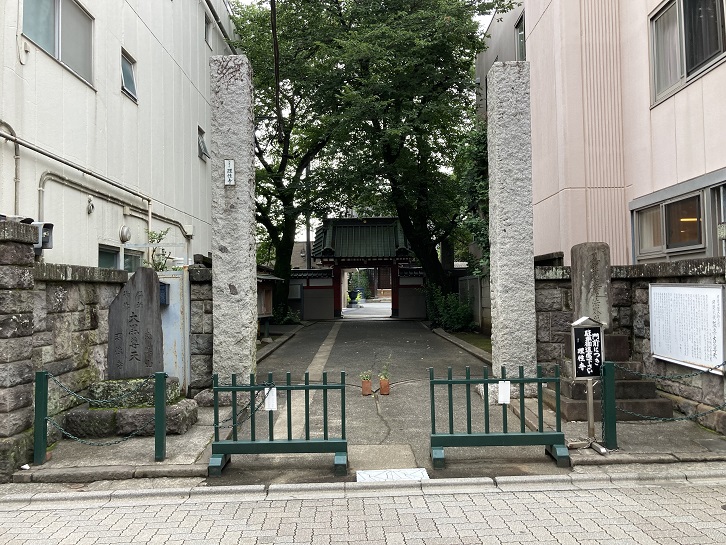 当寺は泉谷山と号する曹洞宗(禅宗)の寺院で、本尊は釈迦如来坐像です。寺伝によれば、慶長八年(1603年)に徳川家康が開基となって、江戸赤坂溜池のあたりに大渕寺の名で建立されました。開山は諦巌和尚(武田信玄の弟)と伝わります。しかし、寛永十八年(1641年)正月に発生した江戸の大火で諸堂を類焼し、跡地は御用地として召し上げられ、その代地として伊皿子に寺地を拝領して移転しました。そのころ、大渕寺の寺名を大圓寺に改めています。江戸で死去した薩摩藩主島津光久の嫡子綱久の葬儀を延宝元年(1673年)に行って以来、藩邸に隣接する当寺は、島津家の江戸における菩提寺となりました。寺内には薩摩家代々の位牌堂が設けられています。このころ、当寺に塔頭として福寿院(本尊・釈迦如来)、門能院(本尊・阿弥陀如来)の二院が建立され、それぞれ大名の保科、旗本の五井・松平・本多・土方の諸家中、町人衆を檀徒として隆盛を極めました。明治四十一年(1908年)、寺院の発展をはかり、この二院の塔頭を併合して現在地に移転し、今日に至っています。境内には、石像の仁王尊や寛永二年(1625年)に芝浦の海中から出現したといわれる塩見地蔵尊石像、また島津家寄進の宝筐印塔・六地蔵尊があり、墓地には益満休之助他七十五名の名を刻んだ「戊辰薩藩戦死者墓」並びに横山安武・八田知紀等の墓があります。ほかに、当寺近辺から出土した板碑も所蔵されています。
