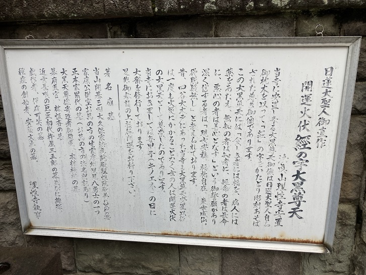 参道入口の脇には、「大黒尊天」と彫られた石碑が建っています。理性寺には、日蓮の作といわれる「火伏せの大黒天」という大黒天像が安置されています。この大黒天は、火災の時に大団扇をもって現れて、火災を防いだという逸話から「火伏せの大黒天」と呼ばれるようになりました。大黒尊天像は拝めませんでしたが。