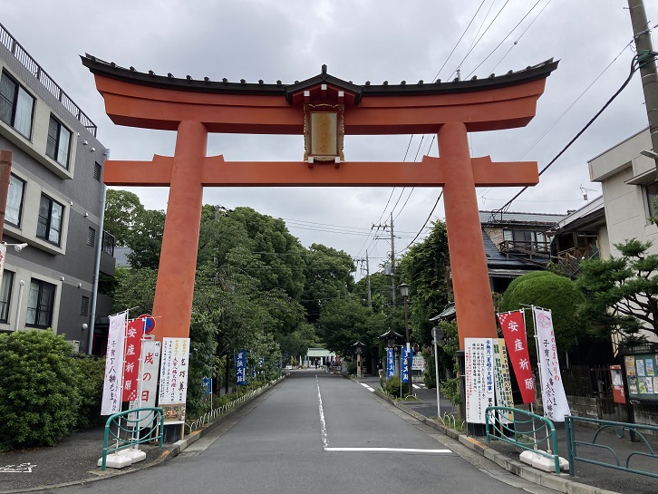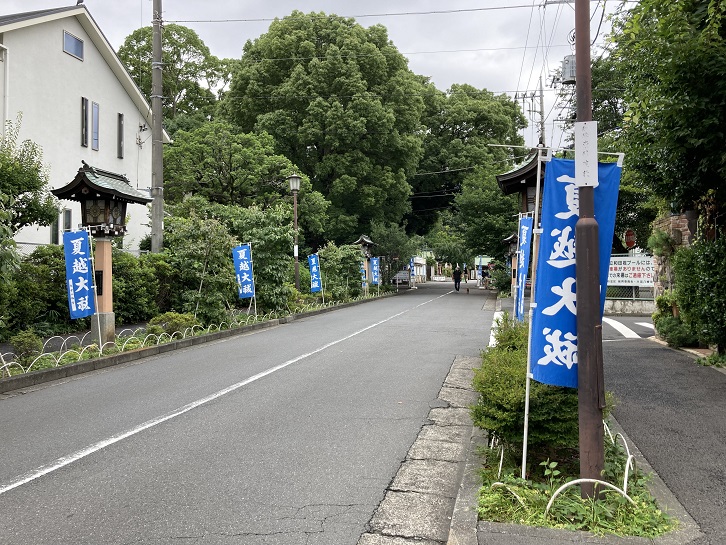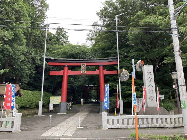見所ポイント2の「大宮八幡宮」にやってきました。南参道入口は自動車社会に対応するために、昭和五十八年の御鎮座920年記念事業で整備され、そこに聳える朱色の大鳥居は日本初のステンレス製の鳥居として建立されました。今日は6月30日です。参道脇には夏越大祓の幟がずらりと並んでいます。大祓は、罪や穢れを祓うための行事で六月と十二月の晦日に行われる行事です。六月の大祓は夏越大祓(なごしのおおはらえ)、十二月の大祓は年越大祓(としこしのおおはらえ)と呼ばれています。大祓は、701年の大宝律令によって正式な宮中の年中行事に定めらました。衣服を毎日洗濯する習慣や水などのない時代、半年に一度、雑菌の繁殖し易い夏を前に新しい服に替える事で疫病を予防する意味があったとされています。