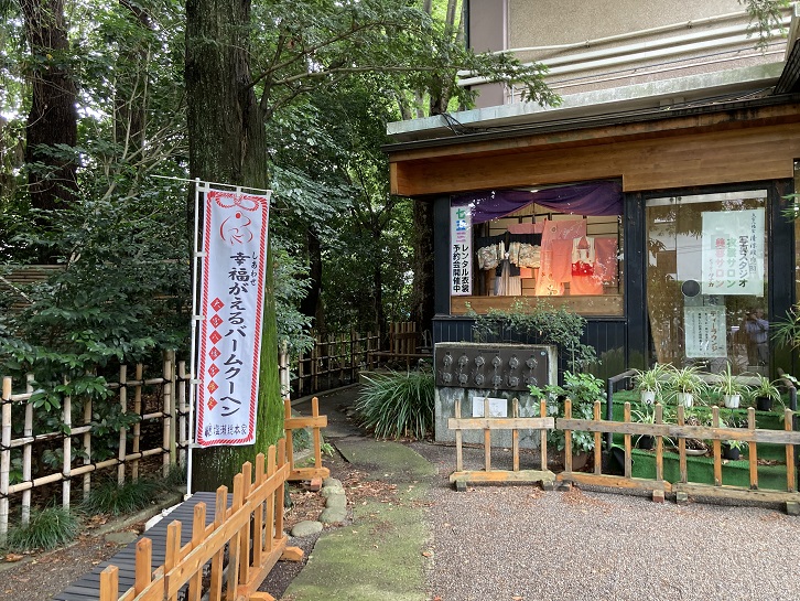 清涼殿には、ティーラウンジと共にお土産コーナーがあり、「幸福がえる バームクーヘン」も売られています。大宮八幡宮は東京の「臍」に相当する位置にあるとかで、ラウンジでは胡麻で覆われた求肥(粉状のもち米や白玉粉に水飴または水や砂糖を入れ練り上げたもの)に包まれた粒あんが臍を想わせる「へそ福餅」も頂けます。
