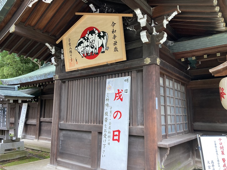 戌(犬)はお産が軽く、一度にたくさんの子犬を産むことから、昔から安産の象徴とされてきました。干支の「戌の日」は12日に一度あり、安定期に入る妊娠5か月目の最初に迎える戌の日に神社へ安産祈願のお参りをする「戌の日参り(帯祝い)」が昔からの慣習として伝わっています。戌の日参りでは、まず安産祈願のご祈祷を受け、妊婦のおなかに腹帯(岩田帯)と呼ばれる帯を巻きます。最近は帯を頂くだけの場合もあります。神社での行事はここまでですが、お参りのあとに祝い膳として食事会を行うことも多いようです。妊婦さんはお酒は御法度ですが。境内には安産を願う妊婦さんの絵馬がびっしりと掛けられています。