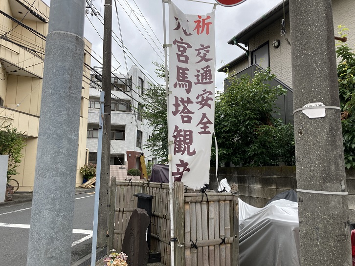 大宮八幡宮参道と荒玉水道の通りの小さな交差点に「祭馬塔」があります。宮家から拝領し、陸軍将校が乗ってきた馬が骨折してここで亡くなったことから建てられたそうです。現在は交通安全の守り観音になっています。