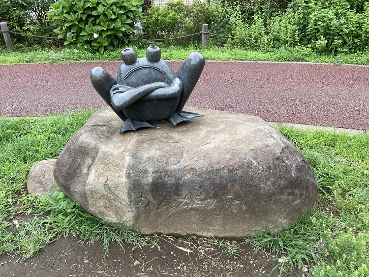 碑に向かい合うように蛙石がおかれている。