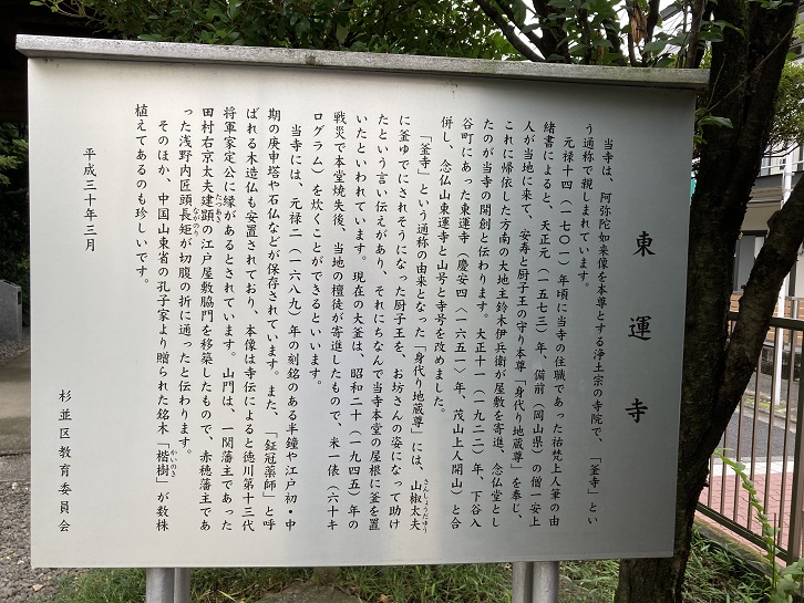 当寺は、阿弥陀如来像を本尊とする浄土宗の寺院で、「釜寺」という通称で親しまれています。元禄十四年(1701年)頃に当寺の住職であった祐梵上人筆の由緒書によると、天正元年(1573年)、備前(岡山県)の僧一安上人が当地に来て、安寿と厨子王の守り本尊「身代り地蔵尊」を奉じ、これに帰依した方南の大地主鈴木伊兵衛が屋敷を寄進、念仏堂としたのが当寺の開創と伝わります。大正十一年(1922年)、下谷入谷町にあった東運寺(慶安四年<1651年>、茂山上人開山)と合併し、念仏山東運寺と山号と寺号を改めました。「釜寺」という通称の由来となった「身代り地蔵尊」には、山椒太夫に釜ゆでにされそうになった厨子王を、お坊さんの姿になって助けたという言い伝えがあり、それにちなんで当寺本堂の屋根に釜を置いたといわれています。現在の大釜は、昭和二十年(1945年)の戦災で本堂焼失後、当地の檀徒が寄進したもので、米一俵(60キログラム)を炊くことができるといいます。当寺には、元禄二年(1689年)の刻銘のある半鐘や江戸初・中期の庚申塔や石仏などが保存されています。また、「鉦冠薬師」と呼ばれる木造仏も安置されており、本像は寺伝によると徳川第十三代将軍家定公に縁があるとされています。山門は、一関藩主であった田村右京太夫建顕の江戸屋敷脇門を移築したもので、赤穂藩主であった浅野内匠頭長矩が切腹の折に通ったと伝わります。そのほか、中国山東省の孔子家より贈られた銘木「楷樹」が数株植えてあるのも珍しいです。