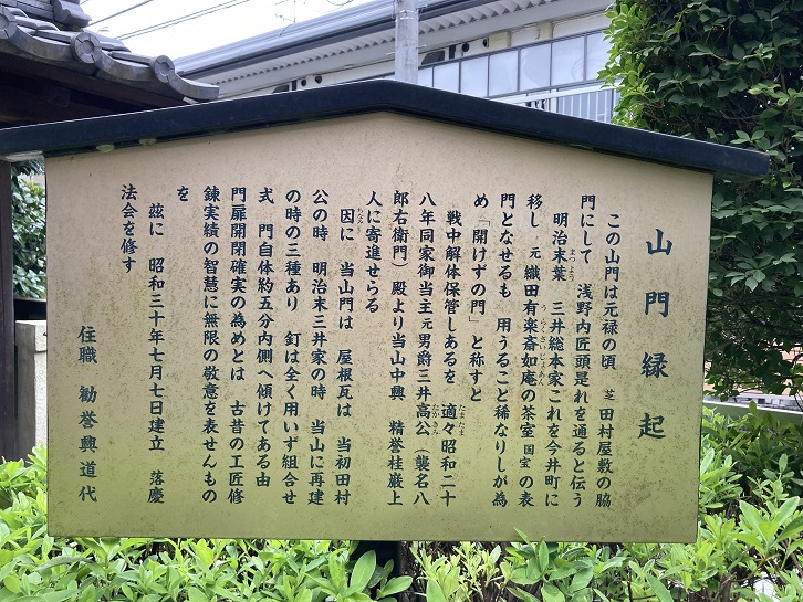 この山門は元禄の頃、芝田村屋敷の脇門にして、浅野内匠頭是れを通ると伝う。明治末葉、三井総本家これを今井町に移し、元織田有楽斎如庵の茶室(国宝)の表門となせるも、用うること稀なりしが為め、「開けずの門」と称すと。戦中解体保管しあるを、適々昭和二十八年同家御当主元男爵三井高公(襲名八郎右衛門)殿より当山中興精誉桂巌上人に寄進せらる。因に 当山門は、屋根瓦は当初田村公の時、明治末三井家の時、当山に再建の時の三種あり、釘は全く用いず、組合せ式。門自体約五分内側へ傾けてある由。門扉開閉確実の為めとは古昔の工匠修錬実績の智慧に無限の敬意を表せんものを。茲に、昭和三十年七月七日建立、落慶法会を修す。