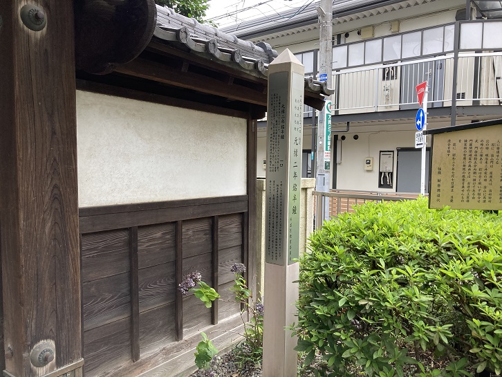 私は見ませんでしたが、半鐘も保存されているようです。山門の前に案内柱が立っています。