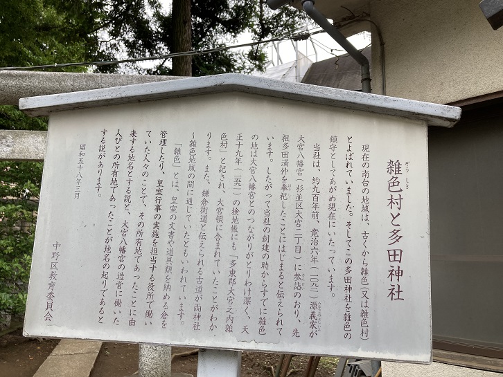 現在の南台の地域は、古くから雑色(又は雑色村)とよばれていました。そしてこの多田神社を雑色の鎮守としてあがめ現在にいたっています。当社は、約九百年前、寛治六年(1092年)源義家が大宮八幡宮(杉並区大宮二丁目)に参詣のおり、先祖多田満仲を奉祀したことにはじまると伝えられています。したがって当社の創建の時からすでに雑色の地は大宮八幡宮とのつながりがとりわけ深く、天正十九年(1591年)の検地帳にも「多東郡大宮之内雑色村」と記され、大宮領に含まれていたことがわかります。また、鎌倉街道と伝えられる古道が両神社〜雑色地域の間に通じていたともいわれています。「雑色」とは、皇室の文書や道具類を納める倉を管理したり、皇室行事の実施を担当する役所で働いていた人々のことで、その所有地であったことに由来する地名とする説と、大宮八幡宮の造営に働いた人びとの所有地であったことが地名の起りであるとする説があります。