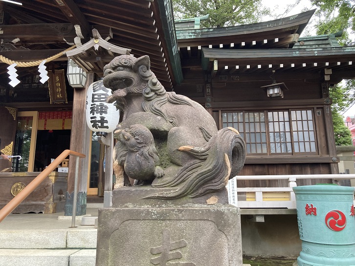 多田神社の狛犬は子持ちファミリーです。母狛犬は子をあやし、父狛犬はボール遊びに誘っています。
