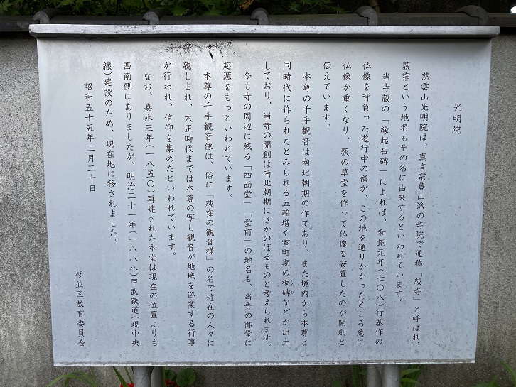 慈雲山光明院は、真言宗豊山派の寺院で通称「荻寺」と呼ばれ、荻窪という地名もその名に由来するといわれています。当寺蔵の「縁起石碑」によれば、和銅元年(708年)行基作の仏像を背負った遊行中の僧が、この地を通りかかったところ急に仏像が重くなり、荻の草堂を作って仏像を安置したのが開創と伝えています。本尊の千手観音は南北朝期の作であり、また境内から本尊と同時代に作られたとみられる五輪塔や室町期の板碑などが出土しており、当寺の開創は南北朝期にさかのぼるものと考えられます。今も寺の周辺に残る「四面堂」・「堂前」の地名も、当寺の御堂に起源をもつといわれています。本尊の千手観音像は、俗に「荻窪の観音様」の名で近在の人々に親しまれ、大正時代までは本尊の写し観音が地域を巡業する行事が行われ、信仰を集めたといわれています。なお、嘉永三年(1850年)再建された本堂は現在の位置よりも西南側にありましたが、明治二十一年(1888年)甲武鉄道(現中央線)建設のため、現在地に移されました。