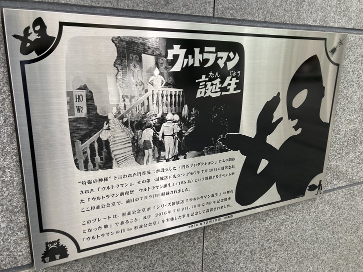 「特撮の神様」と言われた円谷英二が設立した「円谷プロダクション」により制作された「ウルトラマン」。その第一話放送に先立つ1966年7月10日に放送された「ウルトラマン前夜祭 ウルトラマン誕生」(TBS系)という番組PRイベントがここ杉並公会堂で、前日の7月9日に収録されました。このプレートは、杉並公会堂が「シリーズ初放送『ウルトラマン誕生』の舞台となった地」であること、及び2016年7月9日・10日に50年記念催事「ウルトラマンの日 in 杉並公会堂」を実施した事を記念して設置されました。
