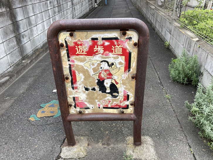 遊歩道の入口に金太郎さんの車止めが設置されています。金太郎が登場したのは昭和五十年(1975年)頃です。当時の杉並区広報に「悪質ドライバー阻止に金太郎さんの車止がお目みえ」という写真が掲載されています。昭和四十年代から杉並区内の河川や水路に蓋をする暗渠化が始まり、その上が歩道になった際に、車の進入を防ぐ車止めが設置されました。このうち、子供が遊んだりよく通ったりする遊歩道には、昔話を知るきっかけにと金太郎のパネル付きのものが採用されたそうです。当時の車止めは鉄製で、雨水などにより経年劣化しやすかったため、平成以降は順次ステンレス製に置き換えられています。この流れを受けて、かつて身近に見られた金太郎の車止めも次第に姿を消し、現在では50数基になっています。