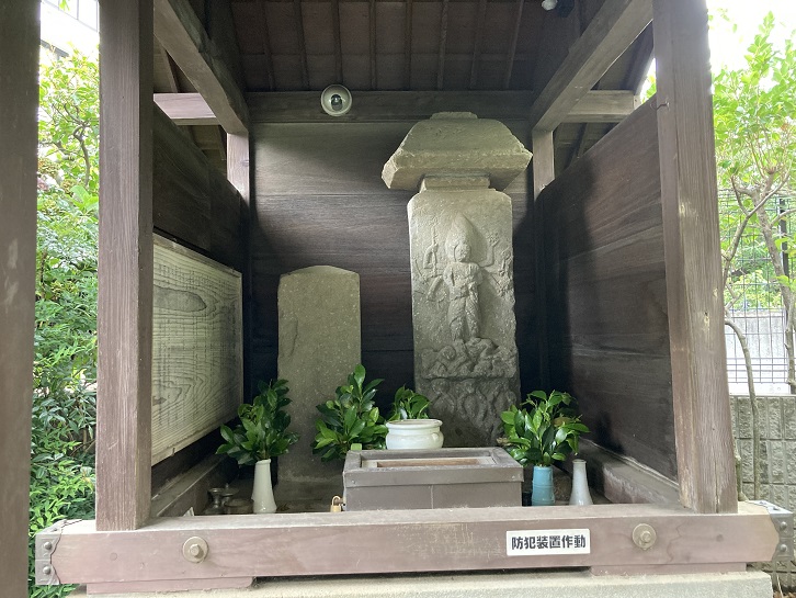 門前の横に3本の案内柱が立っています。観音菩薩座像は本尊ですので拝謁は叶いませんでしたが、板碑と手水鉢は境内にあった筈ですが見落としました。観音菩薩座像の小面は十一体とありますが、左右の垂髻部に二面・地髻部に八面と、どう足しても十一面にはならないのですが?