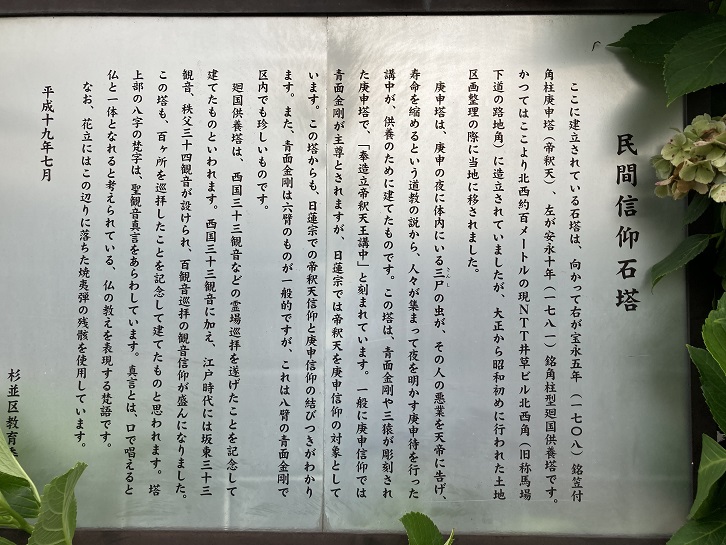 ここに建立されている石塔は、向かって右が宝永五年(1708年)銘笠付角柱庚申塔(帝釈天)、左が安永十年(1781年)銘角柱型廻国供養塔です。かつてはここより北西約百メートルの現NTT井草ビル北西角(旧称馬場下道の路地角)に造立されていましたが、大正から昭和初めに行われた土地区画整理の際に当地に移されました。庚申塔は、庚申の夜に体内にいる三尸(さんし)の虫が、その人の悪業を天帝に告げ、寿命を縮めるという道教の説から、人々が集まって夜を明かす庚申待を行った講中が、供養のために建てたものです。この塔は、青面金剛や三猿が彫刻された庚申塔で、「奉造立帝釈天王講中」と刻まれています。一般に庚申信仰では青面金剛が主尊とされますが、日蓮宗では帝釈天を庚申信仰の対象としています。この塔からも、日蓮宗での帝釈天信仰と庚申信仰の結びつきがわかります。また、青面金剛は六臂のものが一般的ですが、これは八臂の青面金剛で区内でも珍しいものです。廻国供養塔は、西国三十三観音などの霊場巡拝を遂げたことを記念して建てたものといわれます。西国三十三観音に加え、江戸時代には坂東三十三観音、秩父三十四観音が設けられ、百観音巡拝の観音信仰が盛んになりました。この塔も、百ヶ所を巡拝したことを記念して建てたものと思われます。塔上部の八字の梵字は、聖観音真言をあらわしています。真言とは、口で唱えると仏と一体となれると考えられている、仏の教えを表現する梵語です。なお、花立にはこの辺りに落ちた焼夷弾の残骸を使用しています。