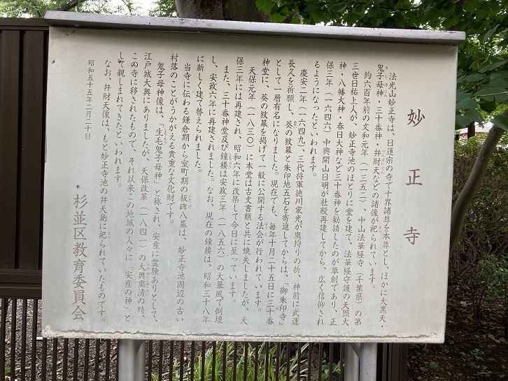 法光山妙正寺は、日蓮宗の寺で十界諸尊を本尊とし、ほかに大黒天・鬼子母神・三十番神・弁財天などの諸像が祀られています。約六百年前の丈和元年(1352年)、中山法華経寺(千葉県)の第三世日祐上人が、妙正寺池のほとりに堂を建て、法華経守護の天照大神・八幡大神・春日大神など三十番神を勧請したのが草創であり、正保三年(1646年)中興開山日明が社殿再建してから、広く信仰されるようになったといわれます。慶安二年(1649年)、三代将軍徳川家光が鷹狩りの折、神前に武運長久を祈願し、葵の紋幕と朱印地五石を寄進してからは、「御朱印寺」として一層有名になりました。現在でも、毎年十月二十五日に三十番神堂に、葵の紋幕を掲げて一般に公開する法会が行われています。天保元年(1830年)に本堂は古文書類と共に焼失しましたが、天保三年には再建され、昭和六年に改築して今日に至っています。また、三十番神堂及び鐘楼は安政三年(1856年)の大暴風で倒壊し、安政六年に再建されました。なお、現在の鐘楼は、昭和三十八年に新しく建て替えられました。当寺に伝わる鎌倉期から室町期の板碑八基は、妙正寺池周辺の古い村落のことがうかがえる貴重な文化財です。鬼子母神像は、「生毛鬼子母神」と称され、安産に霊験ありとして、江戸城大奥にありましたが、天保改革(1841年)の大興粛清の時、この寺に移されたもので、それ以来この地域の人々に「安産の神」として親しまれてきたといわれます。なお、弁財天像は、もと妙正寺池の弁天島に祀られていたものです。