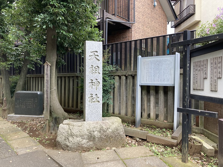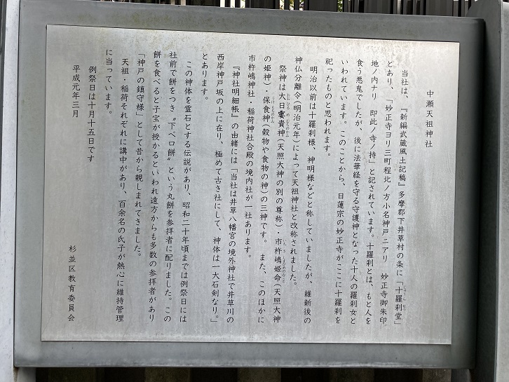 当社は、「新編武蔵風土記稿」多摩郡下井草村の条に「十羅刹堂」とあり、「妙正寺ヨリ三町程北ノ方小名神戸ニアリ 妙正寺御朱印地ノ内ナリ 即此ノ寺ノ持」と記されています。十羅刹とは、もと人を食う悪鬼でしたが、後に法華経を守る守護神となった十人の羅刹女といわれています。このことから、日蓮宗の妙正寺がここに十羅刹を祀ったものと思われます。明治以前は十羅刹様、神明様などと称していましたが、維新後の神仏分離令(明治元年)によって天祖神社と改称されました。祭神は大日(れい)貴神(おおひるめむちのかみ:天照大神の別の尊称)・市杵嶋姫命(いちきしまひめのみこと:天照大神の姫神)・保食神(うけもちのかみ:穀物や食物の神)の三神です。また、このほかに市杵嶋神社・稲荷神社合殿の境内社が一社あります。「神社明細帳」の由緒には「当社は井草八幡宮の境外神社で井草川の西岸神戸坂の上に在り、極めて古き社にして、神体は一大石剣なり。」とあります。この神体を霊石とする伝説があり、昭和二十年頃までは例祭日には社前で餅をつき“下ベロ餅”という丸餅を参拝者に配りました。この餅を食べると子宝が授かるといわれ遠方からも多数の参拝者があり「神戸の鎮守様」として昔から親しまれてきました。天祖・稲荷それぞれに講中があり、百余名の氏子が熱心に維持管理に当っています。例祭日は十月十五日です。