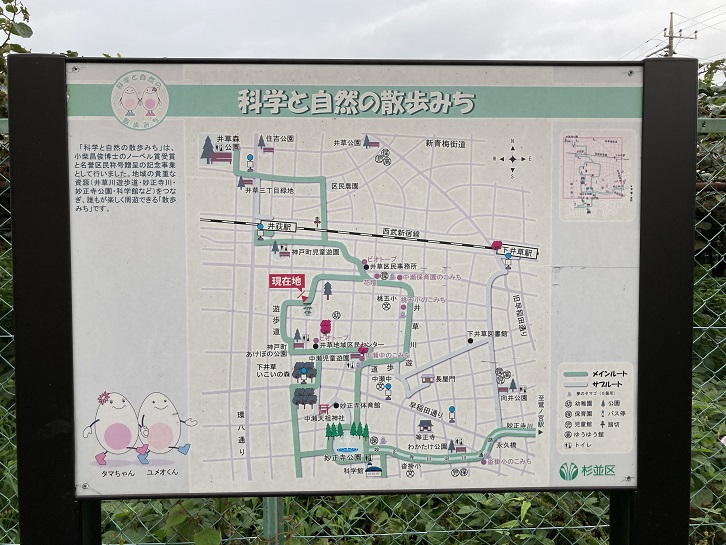 道路脇に「科学と自然の散歩道」の案内板が置かれています。下井草地区にはあちこちに置かれていて、お散歩の際のガイドになっています。「科学と自然の散歩道」は、ノーベル物理学賞を受賞し、杉並区内に在住した小柴昌俊博士が「ぐるっと回れる散歩道があれば」と提案したことがきっかけで誕生しました。駅前や周辺の公園を周遊できるように道がつながり、小柴博士の手形が刻まれたタマゴの石像や地元の小学生らが作ったオブジェも沿道に置かれています。