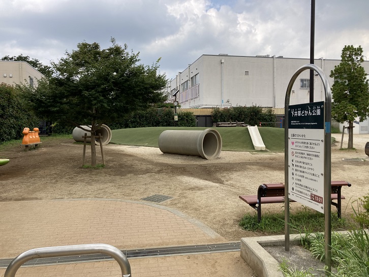 子供・子育てプラザ下井草の裏に整備された下井草どかん公園は、2021年3月20日に開園した新しい公園です。その名の通り、公園内には大きな土管がゴロゴロと置かれています。かってプラザ下井草が下井草児童館だったころ、児童館の隣には向井公園(通称じゃり公)がありました。向井公園の場所に保育園が建てられることになり、代わりに遊び場112番という公園が出来ました。そしてその遊び場112番がさらに広くなって下井草どかん公園として再整備されることになりました。公園の名前は地域の人が案を募集し、区に提案して決められました。何故土管が置かれたのかはよく分かりませんが、単なる遊具なのかもしれません。杉並区では久我山東原公園を保育園に転用する際に激しい反対運動があったそうですが、ここではどうだったのでしょうか?