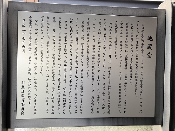 この地蔵堂は、正徳三年(1713年)六月に観泉寺(今川2−16−1)持として、旧下井草村字向井草の現在地に創立されました。別称・平等軒ともいわれ、本尊は地蔵菩薩です。「新編武蔵風土記稿」に「見捨地五畝 小名井草前ニアリ 四間二三間ノ堂ニテ南向 本尊木ノ立像ニテ長一尺七寸 遅野井村観泉寺持」と、この地蔵堂の記述があります。天保五年(1834年)二月には、観泉寺が下井草村の年寄田中惣兵衛にこの堂の管理をまかせていました。その後、天保十二年(1841年)に間口五間・奥行三間の堂を焼失してしまいました。翌天保十三年(1842年)九月、田中惣兵衛が村民の代表者となって、鳥見役にその再建を願い出たという記録が残されています。明治初年には、観泉寺庵室となり、慈照という尼僧が住むようになりました。その当時は、境内は九十坪の年貢地でしたが、明治十年代初めには、境内は百三十坪となり、信徒も三十一人を数えるにいたりました。その後、観泉寺から独立し、現在の境内は三坪、堂宇は二間四方となりました。平成の初め頃までは、約三十人で結ばれた地蔵講中があり、毎年十一月二十四日に夜、堂前左右に行燈を立て、燈明を献じ、般若心経を唱和した後、酒食を共にするならわしがありました。現在は、地元有志の方によって大切に管理されています。なお、堂前、左側の石造物は、宝暦八年(1758年)八月建立の地蔵菩薩を刻した石橋供養塔で、右側の二基は、江戸時代の石塔です。