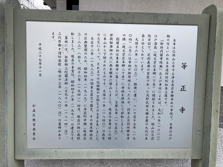 当寺は応供山と号する浄土真宗本願寺派の寺院で、本尊は江戸期の作といわれる木造阿弥陀如来立像です。「御府内備考続編」および寺伝によれば、元和八年(1622年)江戸湯島(現文京区本郷一丁目)に開創されました。開山は不退院玄証で、足利義満の家臣であった浅野民部大輔永慶の九代の末裔と伝えられています。元禄十六年(1703年)、類焼に遭い、ついで翌十七年(1704年)二月には寺地が御用地となったため、同年三月同所興安寺の隣(現文京区本郷二丁目)に寺地を拝領して移転しました。創建当初は東本願寺に属しましたが、宝暦九年(1759年)八世敬胆律師の代に西本願寺に帰山しました。現在の本尊はこの時に本山から下附されたものです。天保十一年(1840年)の再度の火災によって、それまでの記録類や宝物などの大半を失いました。大正十二年(1923年)の関東大震災で罹災、その後本郷地区の区画整理のため、昭和四年(1929年)に井荻町中瀬(現清水3−23)へ移り、同十六年(1941年)四月、現在の地に再移転しました。現在の本堂は、昭和四十六年(1971年)の建立です。墓地には、狂歌師三陀羅法師(文化十一年【1814年】没)、三代目都々逸坊扇歌(明治十三年【1880年】没)の墓碑があり