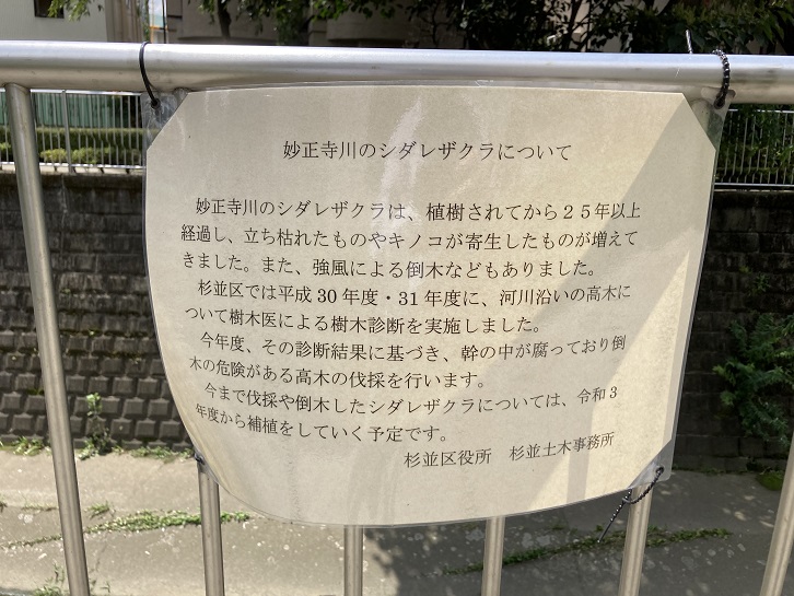 妙正寺川のシダレザクラは、植樹されてから25年以上経過し、立ち枯れたものやキノコが寄生したものが増えてきました。また、強風による倒木などもありました。杉並区では平成三十年度・三十一年度に、河川沿いの高木について樹木医による樹木診断を実施しました。今年度、その診断結果に基づき、幹の中が腐っており倒木の危険がある高木の伐採を行います。今まで伐採や倒木したシダレザクラについては、令和三年度から補植をしていく予定です。