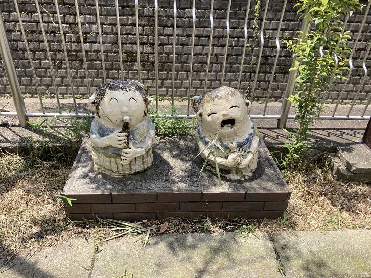 妙正寺川の遊歩道には、様々なモニュメントが置かれています。これらの人形は日常生活の一コマを表現しているようです。