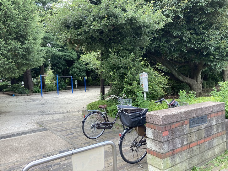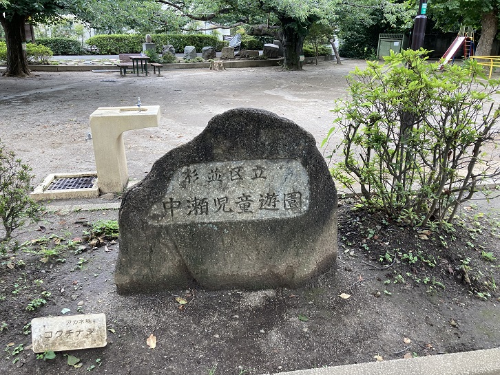 妙正寺川に面してわかたけ公園があります。園内にはタイヤが半分埋まっている遊具があり、飛んだり乗ったりと様々な遊びが楽しめます。園名の「わかたけ」を表しているのか、石銘板の上には筍が2本生えています。名称を彫り込んだだけの石銘板が多いのですが、こういう遊び心も面白いですね。