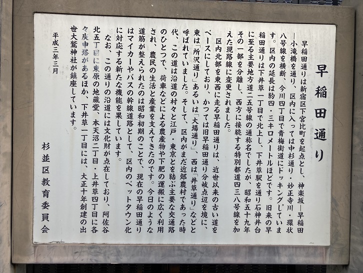 早稲田通りは新宿区下宮比町を起点とし、神楽坂〜早稲田〜小滝橋を通り、区内に入っては中杉通り・妙正寺川・環状八号線を横断、今川四丁目で青梅街道にドッキングしています。区内の延長は約4.3キロメートルほどです。旧来の早稲田通りは下井草一丁目で北上し、下井草駅を通り、石神井台に至る主要地方道25号線の通称名でしたが、昭和五十九年その一部を分離し、西方に接続する特別都道438号線を加えた現路線に変更されました。区内北部を東西に走る早稲田通りは、近世以来の古い道をベースにしており、かつては旧早稲田通り分岐点辺を境に東は「所沢通り」あるいは「大場通り」、西は「井草通り」などと呼ばれていました。そして、区内がまだ近郊農村であった時代、この道は沿道の村々と江戸・東京とを結ぶ主要な交通路のひとつで、荷車などによる農産物や下肥の運搬に広く利用され、農民の生活と産業を支えてきたのです。今日のような道筋が整えられたのは昭和初期のことで、現在の早稲田通りはマイカーやバスの幹線道路として、区内のベットタウン化に対応する新たな機能を果しています。なお、この通りの沿道には文化財が点在しており、阿佐谷北五丁目に東原の地蔵堂、本天沼二丁目・上井草四丁目に各々庚申塔があるほか、下井草一丁目には、大正十年創建の出世大鷲神社が鎮座しています。