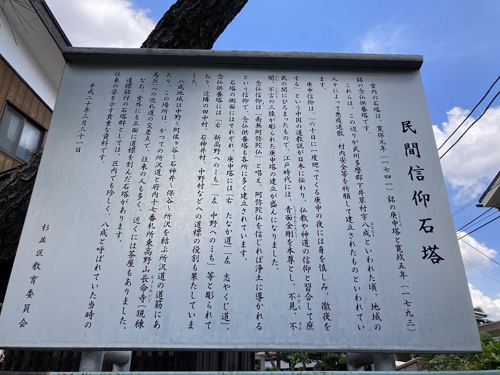 堂内の石塔は、寛保元年(1741年)銘の庚申塔と寛政五年(1793年)銘の念仏供養塔です。これらは、この辺りが武州多摩郡下井草村字八成といわれた頃、地域の人々によって悪疫退散・村内安全等を祈願して建立されたものといわれています。庚申信仰は、「六十日に一度廻ってくる庚申の夜には身を慎しみ、徹夜をする」という中国の道教説が日本に伝わり、仏教や神道の信仰と習合して庶民の間にひろまったもので、江戸時代には、青面金剛を本尊とし、不見(みざる)・不聞(きかざる)・不言(いわざる)の三猿が彫られた庚申塔の建立が盛んになりました。念仏信仰は「南無阿弥陀仏」と唱え、阿弥陀仏を信じれば浄土に導かれるという信仰で、念仏供養塔も各所に多く建立されています。石塔の側面にはそれぞれ、庚申塔には「右 たなか道」「左 志やくじ道」、念仏供養塔には「右 新高野へのミち」「左 中野へのミち」等と彫られており、近隣の田中村・石神井村・中野村などへの道標の役割も果たしていました。八成地域は中野〜阿佐ヶ谷〜石神井〜保谷〜所沢を結ぶ所沢道の道筋にあたり、この場所は、かつての所沢道と府内十七番札所東高野山長命寺(現練馬区)への巡礼道の交差点で、往来の人も多く、近くには茶屋もありました。なお、堂外にも正面に道標を刻んだ石塔があります。道標銘付の石塔群としては、区内でも珍しく、八成と呼ばれていた当時の往来の姿を示す貴重な資料です。