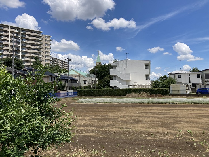 新青梅街道を越えた辺りには、長閑な野菜畑が広がっています。見所ポイント10の教会の見える畑で、建物の向こうには教会の尖塔が見えます。