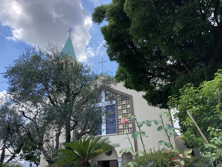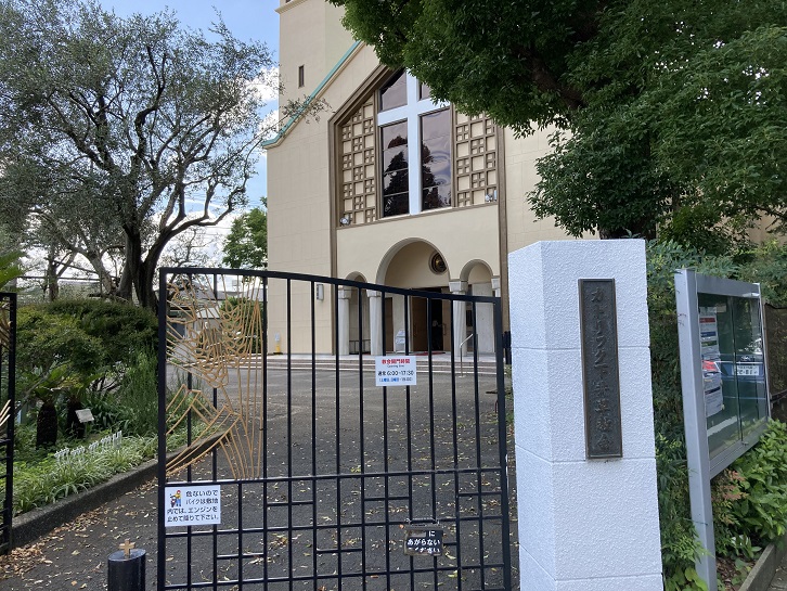 畑が散在する住宅地に遠くからでも見えるこの教会は、昭和二十三年(1948年)に設立され、昭和二十四年(1949年)4月17日の復活祭に認可された東京教区第18番目のサレジオ会の下井草教会です。ソールズベリー大聖堂ほどではありませんが、近くから見ると高い尖塔が天を突いています。現在の聖堂は昭和三十一年(1956年)10月21日に完成しました。建設資金の募金を得るために尽力したマンテガッツア司祭の出身地カルダノ教会と姉妹教会になっていて、高い鐘楼から鳴り響く3個の鐘と、パイプオルガン・聖堂前の無原罪の聖母像・大理石の正面祭壇などがカルダノ教会から寄贈されています。練馬区境に近い杉並区の辺境の地によくぞこのような立派な教会が建ったものです。