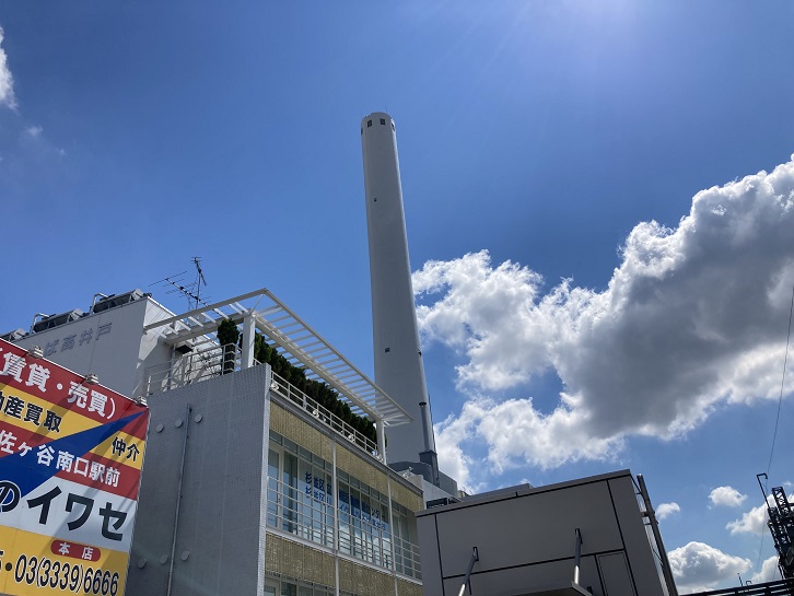 高井戸駅のすぐ横手には杉並清掃工場の煙突が聳えています。かつて美濃部都政時代に東京ゴミ戦争のきっかけとなりましたが、杉並清掃工場内にはその歴史を伝える「東京ごみ戦争歴史みらい館」が設置されています。現在は周辺の高級マンションと清掃工場が共存し、ゴミを燃やした際の廃熱を利用した温水プールが地元民に利用されています。