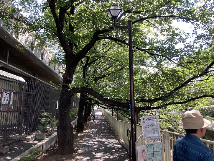 - 今日は杉並区の「12.高井戸・浜田山編 高井戸・桜上水コース」を歩きます。井の頭線の高井戸駅をスタート地点として、環八通りの東側を斜断し、神田川沿いの名所・旧跡を訪ね、京王線の桜上水駅に至ります。お花見の季節であれば神田川沿いの桜を愛でることもできたのでしょうけど、盛夏の季節にあっては、青々とした葉っぱを眺めるだけです。