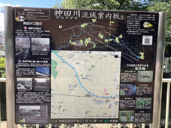 遊歩道脇に「神田川流域案内板B 周辺の紹介」と題した案内板が立っています。