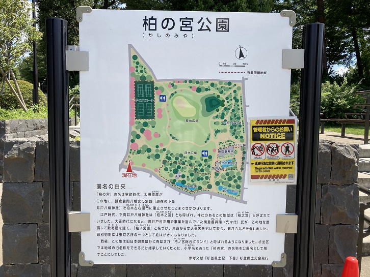 見所ポイント3の「柏の宮公園」は、かって日本興業銀行が所有していたグラウンドが同行のリストラ(みずほ銀行との統合)の際に杉並区に売却され、それを杉並区が公園として整備したものです。平成十六年(2004年)に開園し、敷地面積は4.3ヘクタールと、杉並区立の公園としては最大規模を誇ります。草地広場や池、テニスコート、日本庭園や茶室などに加え、区の防災施設として災害備蓄倉庫や防災井戸も設けられています。案内板には「柏の宮公園」の園名の由来が記されています。