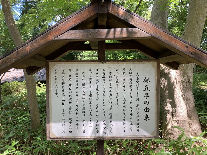 この茶室は寛永年間、若狭小浜藩主酒井忠勝が新宿区矢来町にあった酒井家の江戸下屋敷内の池畔に、小堀遠州に命じて造営したものと伝えられています。当時は「洋の茶屋」と呼ばれ、将軍家光なども御成りになったといわれています。八畳室は、江戸中期の書院造りで、その後江戸末期に水屋、点前席などを増改築したとのことです。のちに、酒井家の江戸下屋敷の一部が旧日本興業銀行矢来寮になり昭和三十四年十二月、当時の頭取が武蔵野の面影を残すこの地に茶室を移築復元し「林丘亭」と名づけられたといわれています。