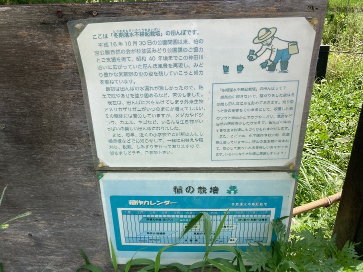 ここは「冬期湛水不耕起栽培」の田んぼです。平成十六年10月30日の公園開園以来、柏の宮公園自然の会が杉並区みどり公園課のご協力とご支援を得て、昭和四十年頃までこの神田川沿いに広がっていた田んぼ風景を再現し、みどり豊かな武蔵野の里の姿を残していこうと努力を重ねています。最初は田んぼの水漏れが激しかったので、粘土で底やあぜを塗り固めるなど、苦労しました。現在は、田んぼに穴をあけてしまう外来生物アメリカザリガニがいつのまにか増えてしまい、その駆除には苦労していますが、メダカやドジョウ、カエル、ヤゴなど、いろんな生き物がいっぱいの楽しい田んぼになりました。また、毎年、近くの小学校やご近所の方にも掲示板などでお知らせして、一緒に田植えや稲刈り、脱穀、もみすりを行っておりますので、皆さまもどうぞ、ご参加下さい。