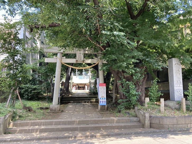 藤和緑地の奥に、見所ポイント7の「下高井戸八幡神社」が鎮座しています。「下高井戸浜田山八幡神社」と、「浜田山」を挟む表記もあります。