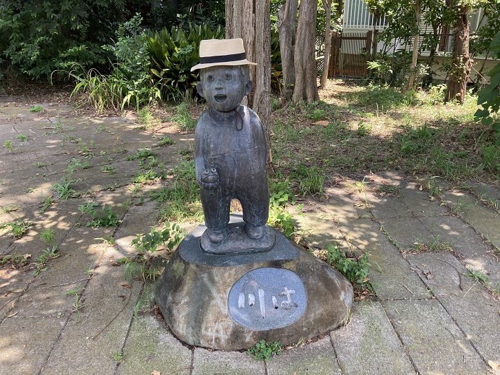 遊歩道の脇に、見所ポイント8の「川は」像が建っています。子供の恰好をしていますが、何を言いたいのかよく分かりません。手の平に持っているのは蛙かな?